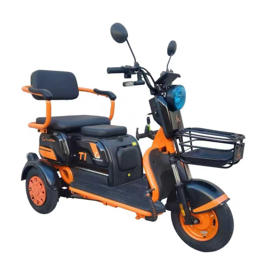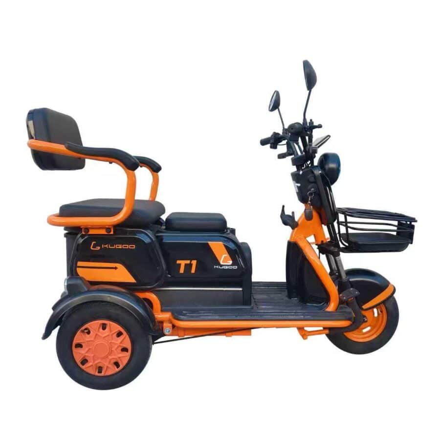 The Kugoo T1 is a compact and efficient three-wheeled electric tricycle designed for comfort, stability, and everyday commuting. With a 500W motor and a 48V/20Ah battery, it delivers a maximum speed of 35 km/h and a mileage of up to 50 km. Its sturdy design, dual seats, and stylish orange/black finish make it a reliable choice for both family and personal use.